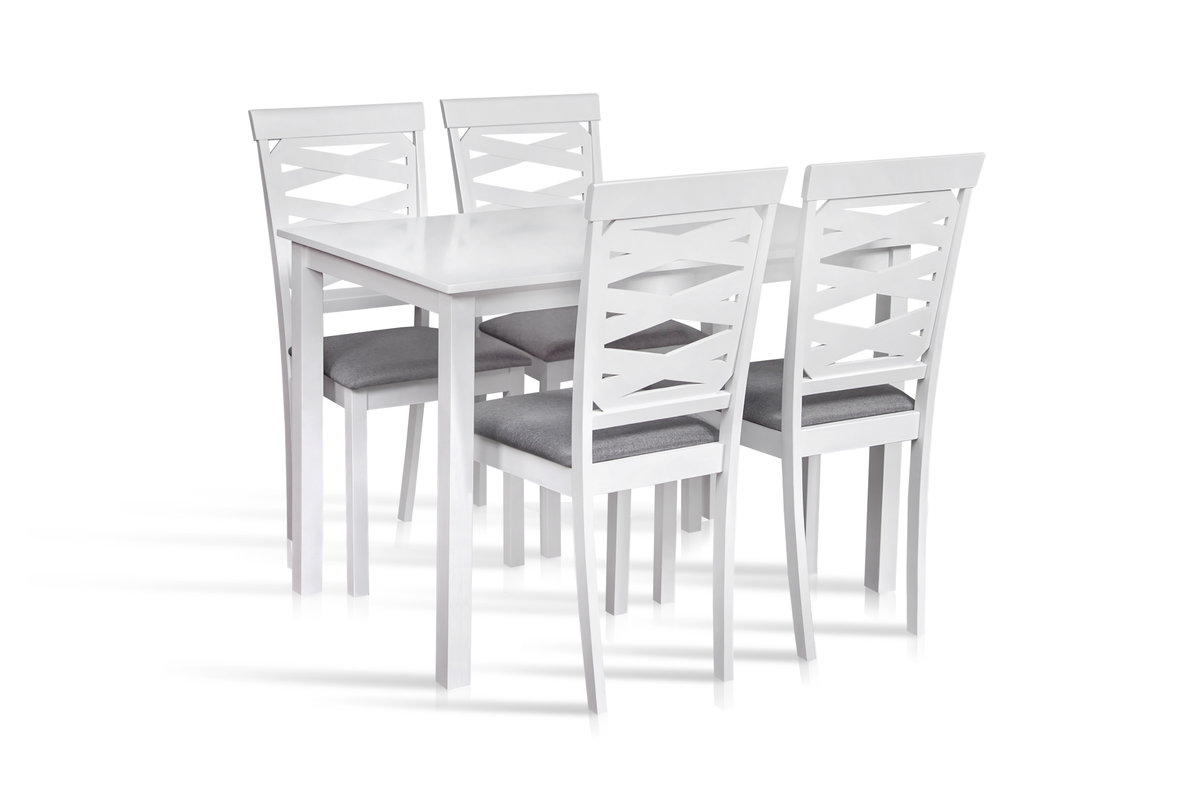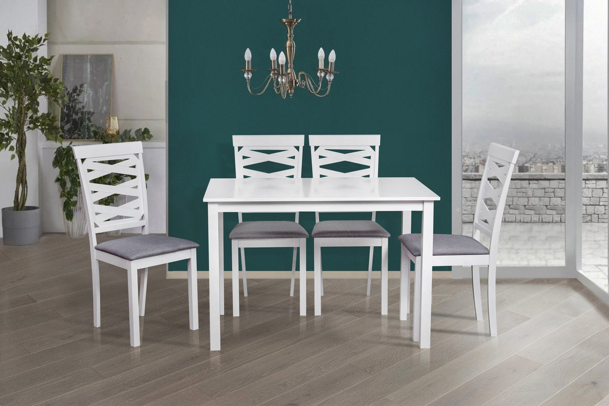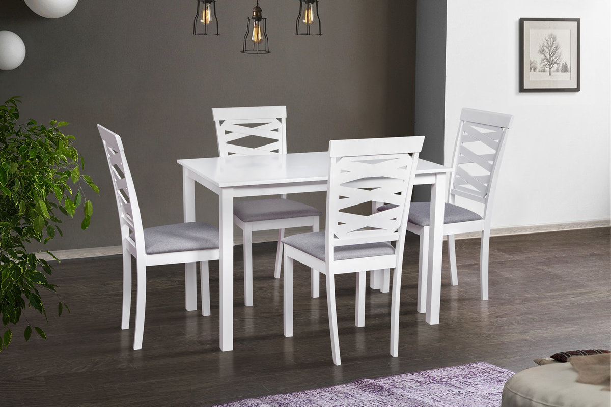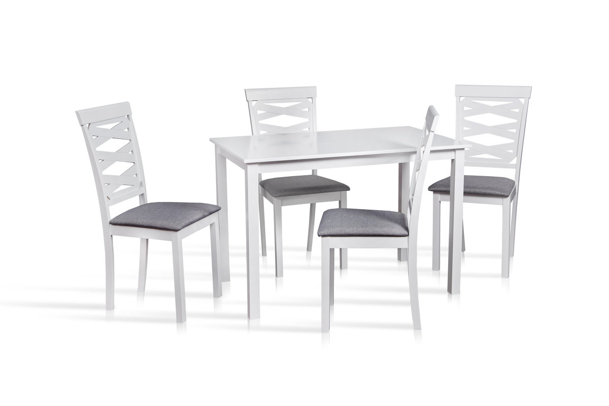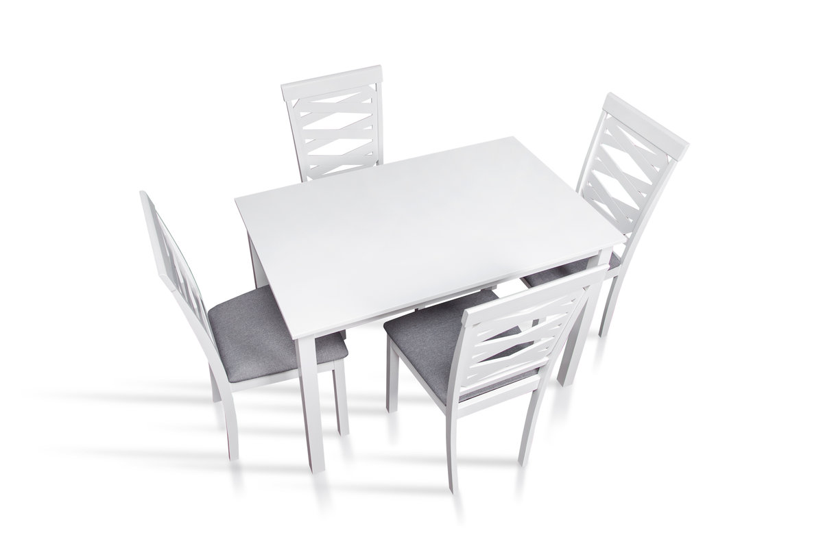 Розмір: Стіл: 1100*700 мм; Висота: 740 мм. Стілець: 370*430; Висота: 940 мм. Колір: Білий ( WHITE); Тканина на стільцях: Сірий. Матеріал: Каркас і ніжки: Дерево, Гевея; Столешня: МДФ. Товщина столешні столу: 16 мм. Товщина ніжок столу: 45 мм. В Комплект входить 1 нерозкладний стіл та 4 стільця. Продаж лише комплектами.