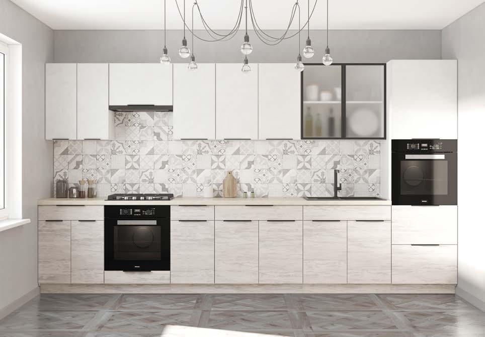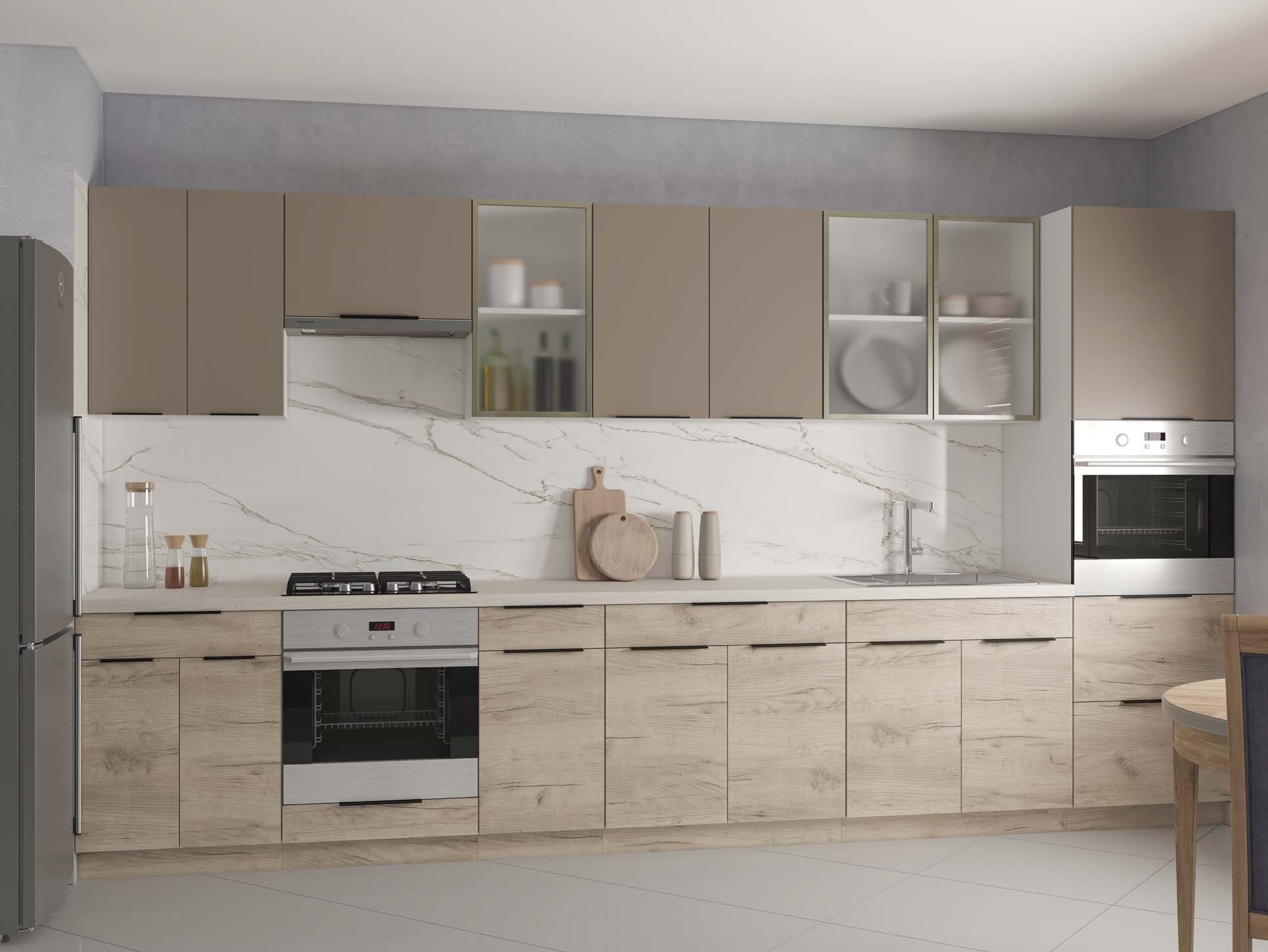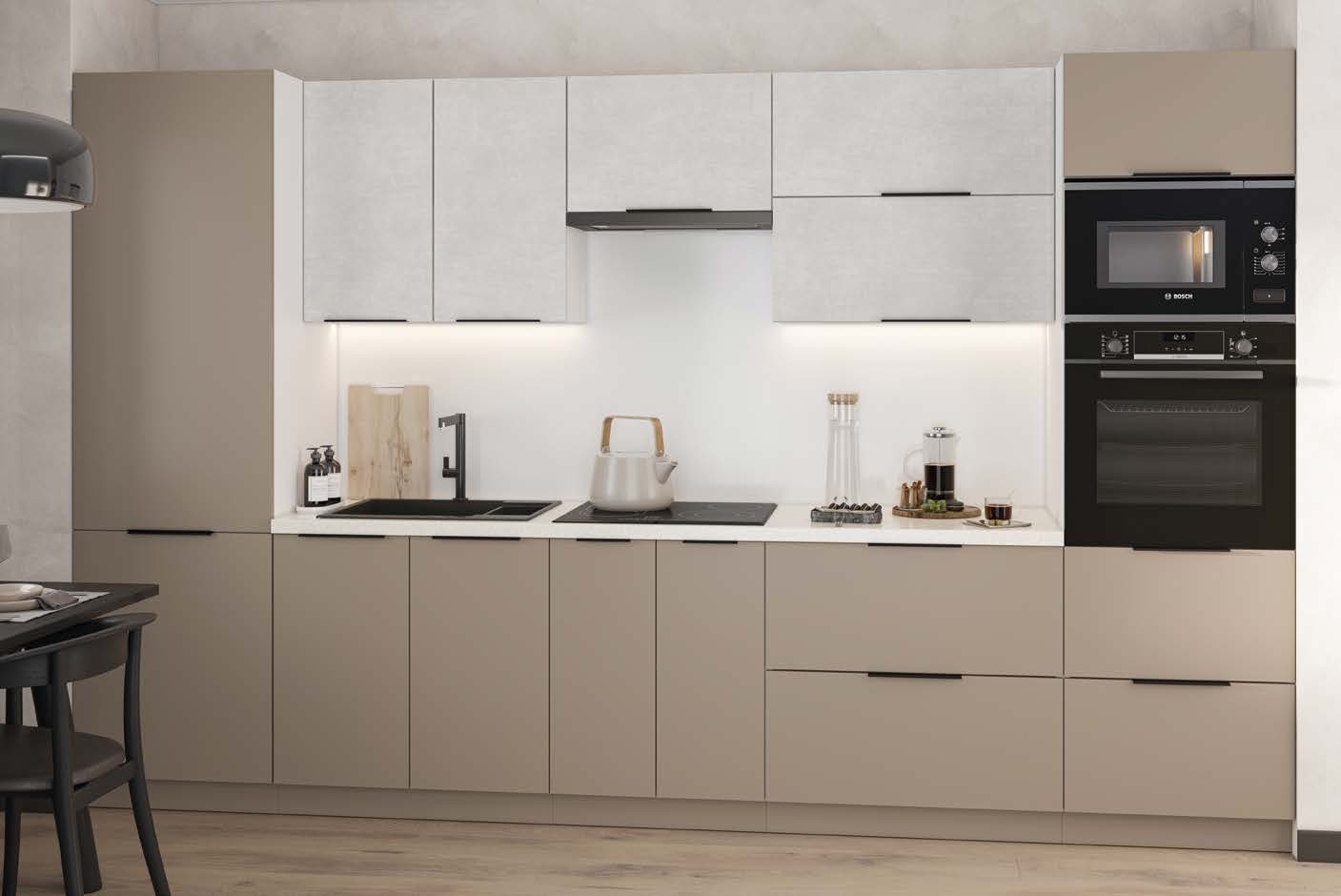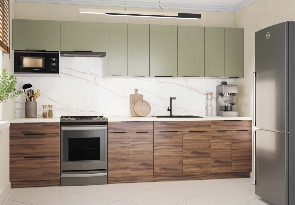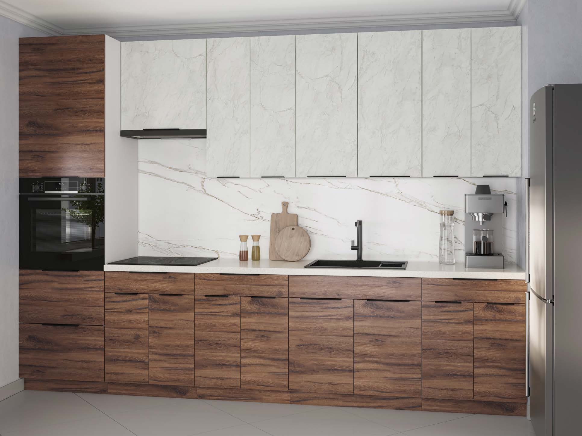 Фасади виготовляються із ДСП. Фасади комплектуються чорною алюмінієвою ручкою із міжцентровим розміром 224/128мм.